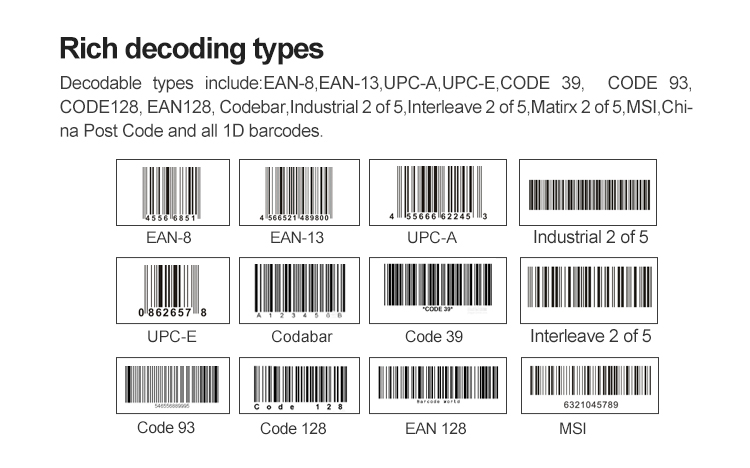 UPC-A, UPC-E, EAN-13, EAN-8, Codabar, Código 39, Código 39 ASCll completo, China Post, Plessey, MSl, Código 93, Código 128, Industrial 2 de 5, Interleave 2 de 5, Matrix 2 de 5, Código 11, ISBN, SSN, Código 32 (código farmacêutico italiano), Código 39 estendido, GS1-128 e ITF-14, SISAS, GS1 Omnidirecional, GS1 Limited, Aviation25, RSS 14. |